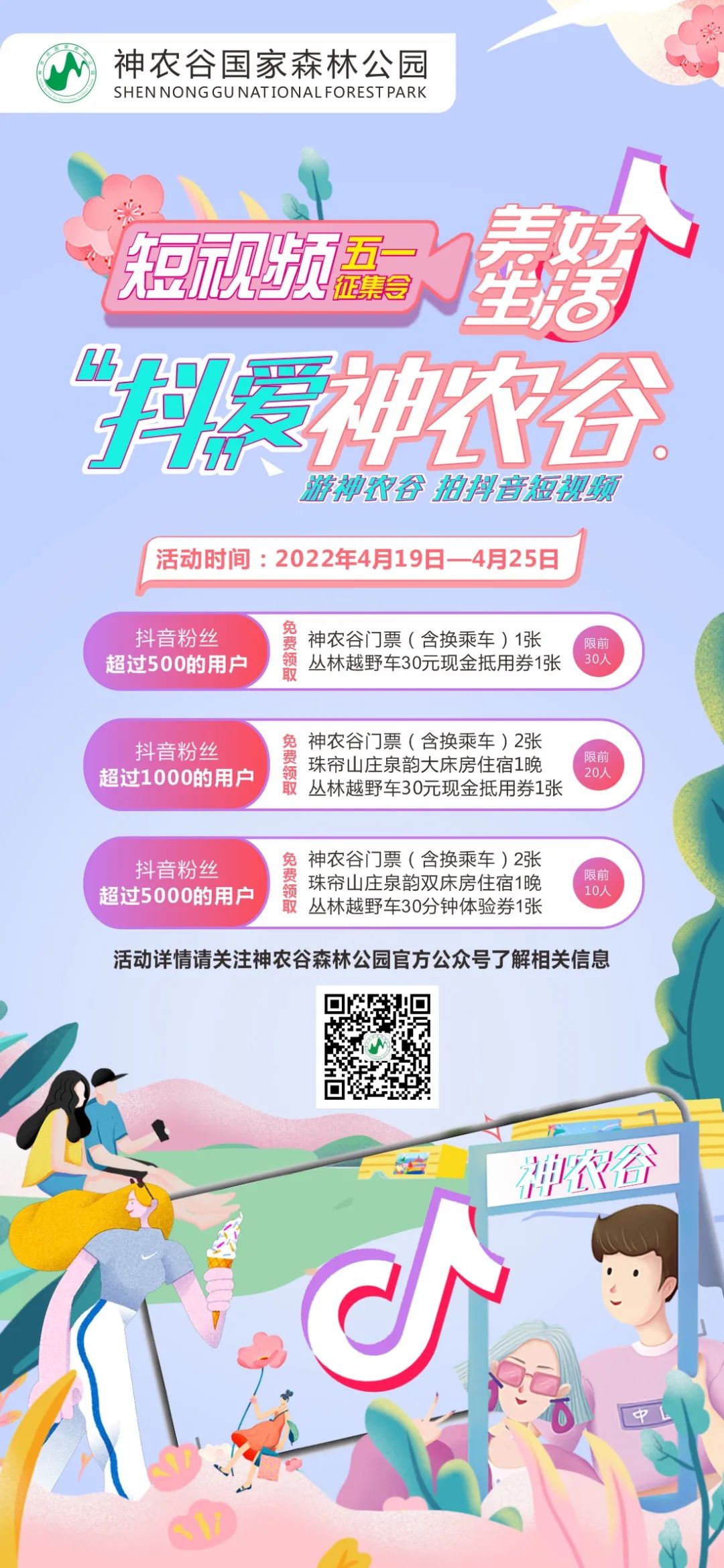 1、抖音粉丝超过500的用户,可免费领取神农谷门票(含换乘车)1张+丛林越野车项目30元现金抵用券1张(限前30人)。