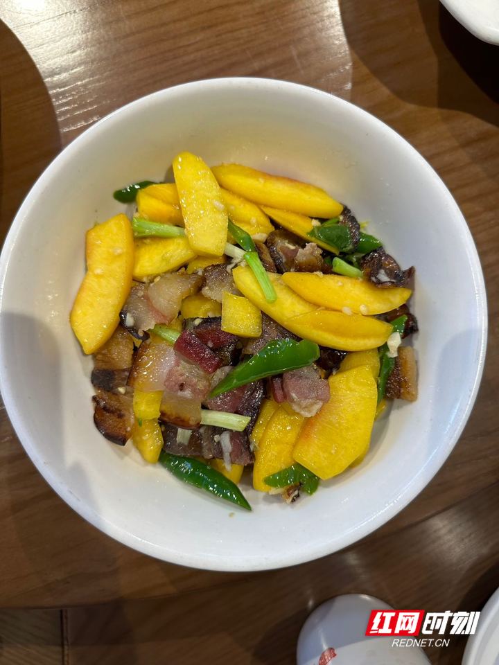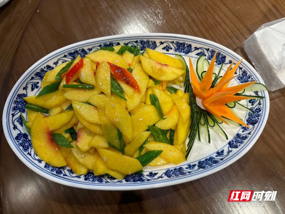 待菜上桌,满桌荤素皆不离“桃”,平日里司空见惯的菜式在黄桃的点缀下也变得色香俱佳,尝一口,黄桃的清甜和饭菜的咸香激烈碰撞,勾勒出独具特色的“炎陵味道”。