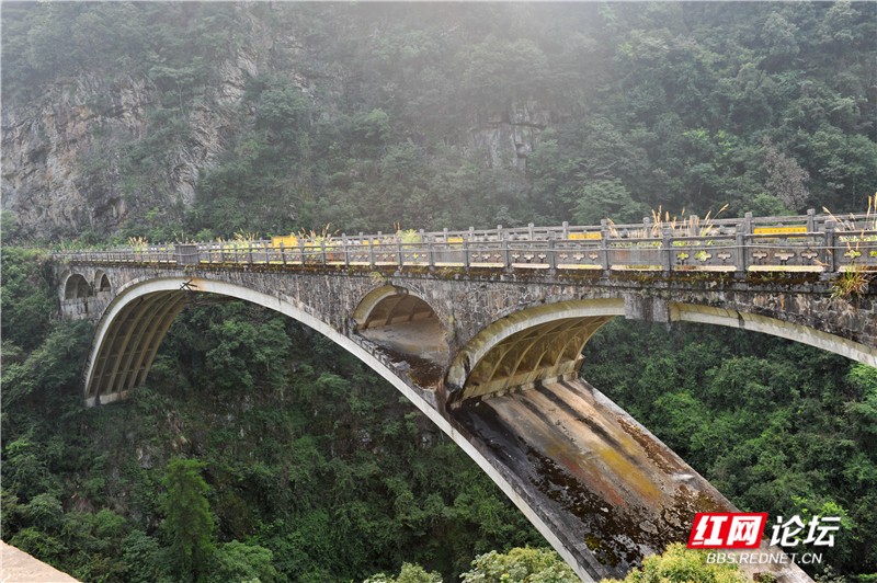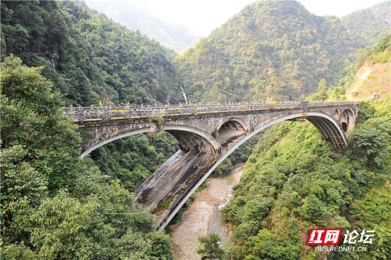 这次到炎陵,许多朋友要我们到红星桥去看看,我们特意在红星桥镇住了下来,利用早晚游览了红星大桥。在红星镇上的三岔路口行走不到500米,就可以看到两座大桥卧于两座大山之间。左边一座桥如拱形长虹,这是已经封闭停用的老红星桥,右边是现在通车使用的钢筋混凝土新桥。